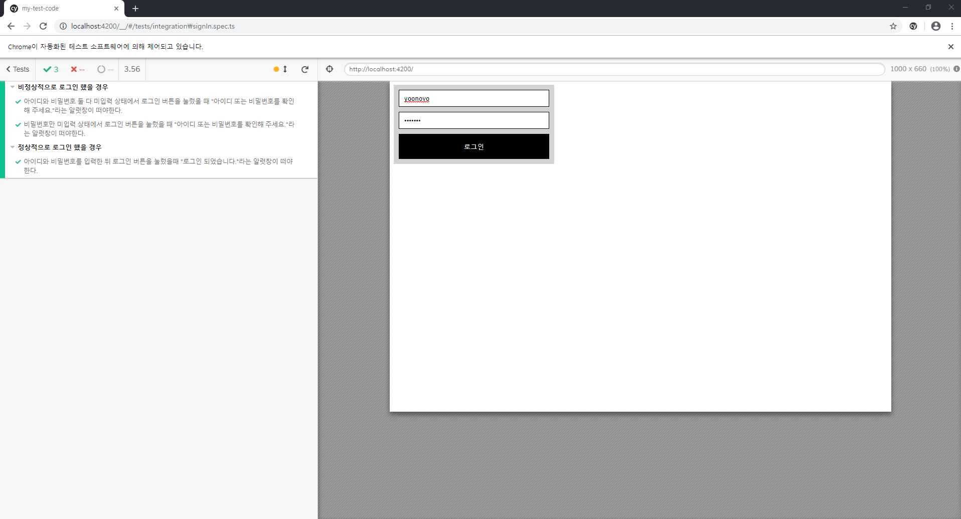 테스트 러너에서 signIn.spec.ts 파일을 클릭하여 실행시켜보면 아래 이미지와 같은 화면이 나올 것이다.
